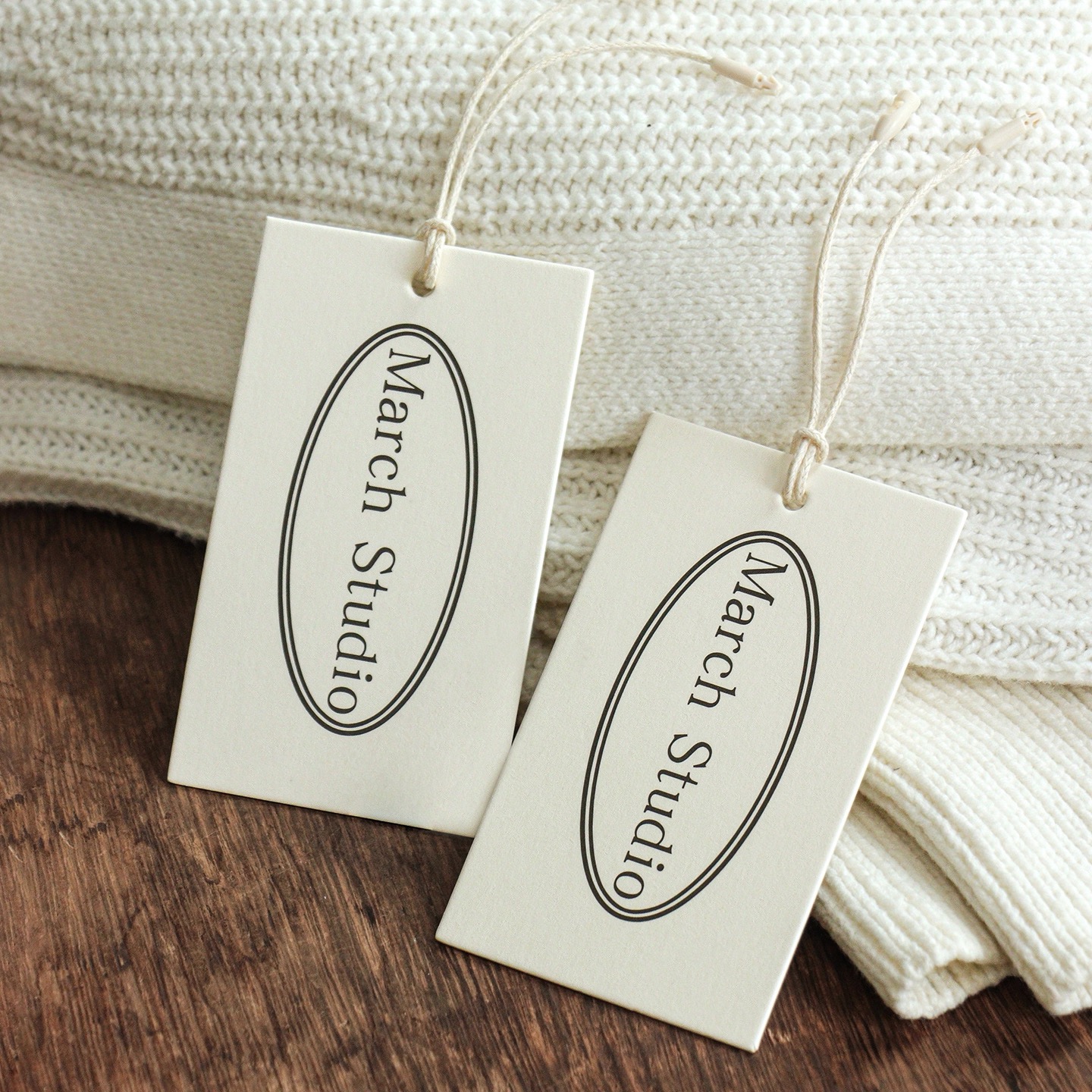 Custom off-white specialty paper clothing store hang tags, custom women's clothing labels with logo designs, and custom men's clothing hang tags.