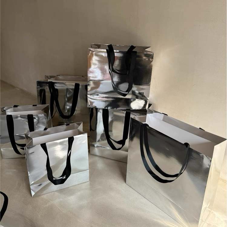 Customizable silver shoulder shopping paper bag for women's clothing, gift and beauty salon Customizable silver shoulder shopping paper bag for women's clothing, gift and beauty salon